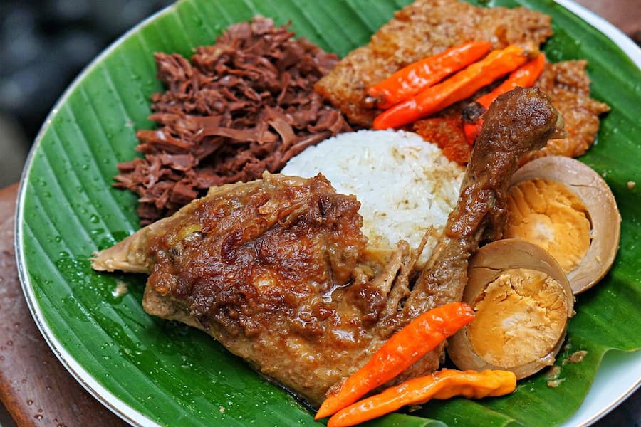 Gudeg bercita rasa manis dengan warna coklat gelap, terbuat dari nangka muda, Saat disajikan dilengkapi dengan areh, sambal goreng krecek, dan laut seperti tempe , tahu, telur, atau daging ayam.